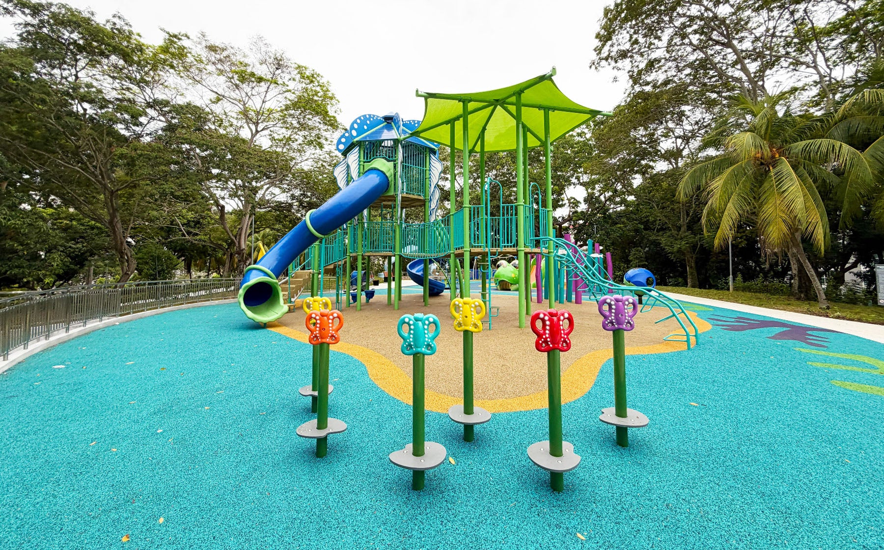 The surrounding play area includes thoughtfully designed elements that echo the coastal theme of Pasir Ris. A cluster of poles and Butterfly Steppers inspired by sea anemones and reef-like steppers promotes agility and imaginative movement. The Cozy Cocoon offers a quiet retreat, while the Standing See-Saw, Merry-Go-Round and Multi-Seat Rocker bring children together through laughter and shared play. Younger ones enjoy interactive play panels that engage their senses through touch and sound.